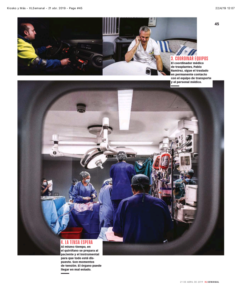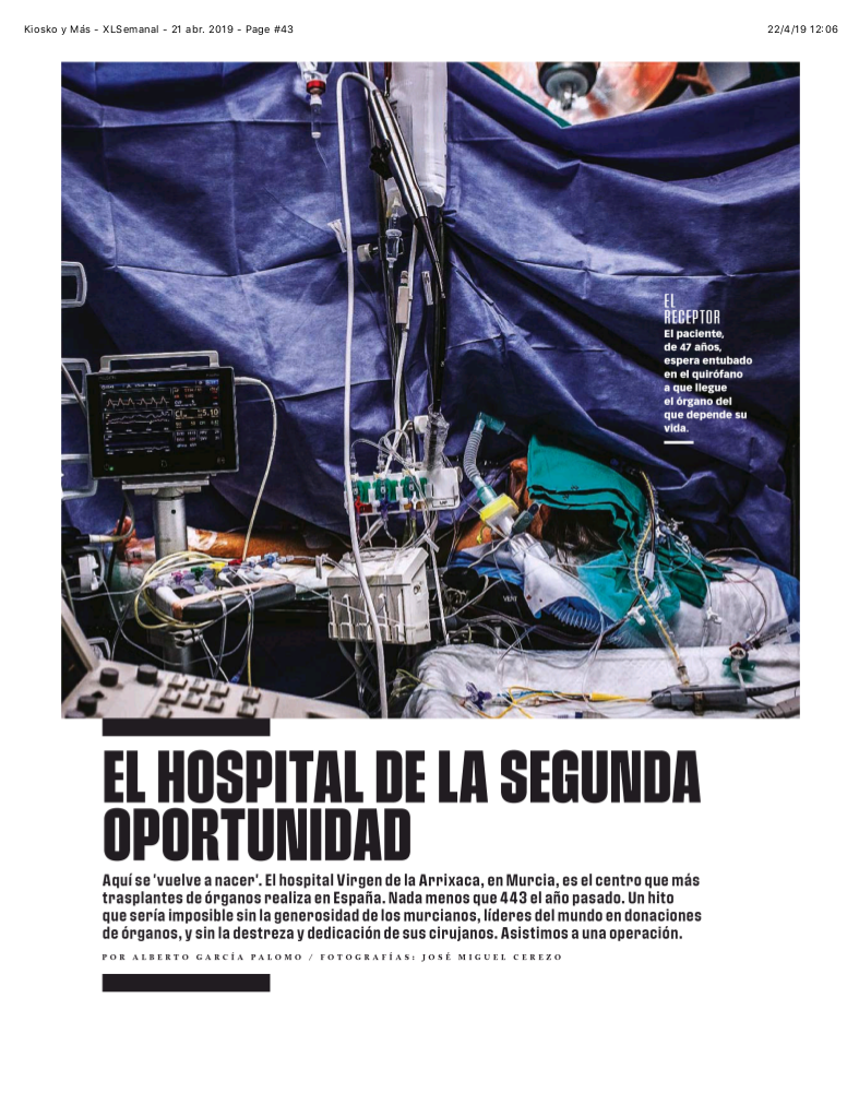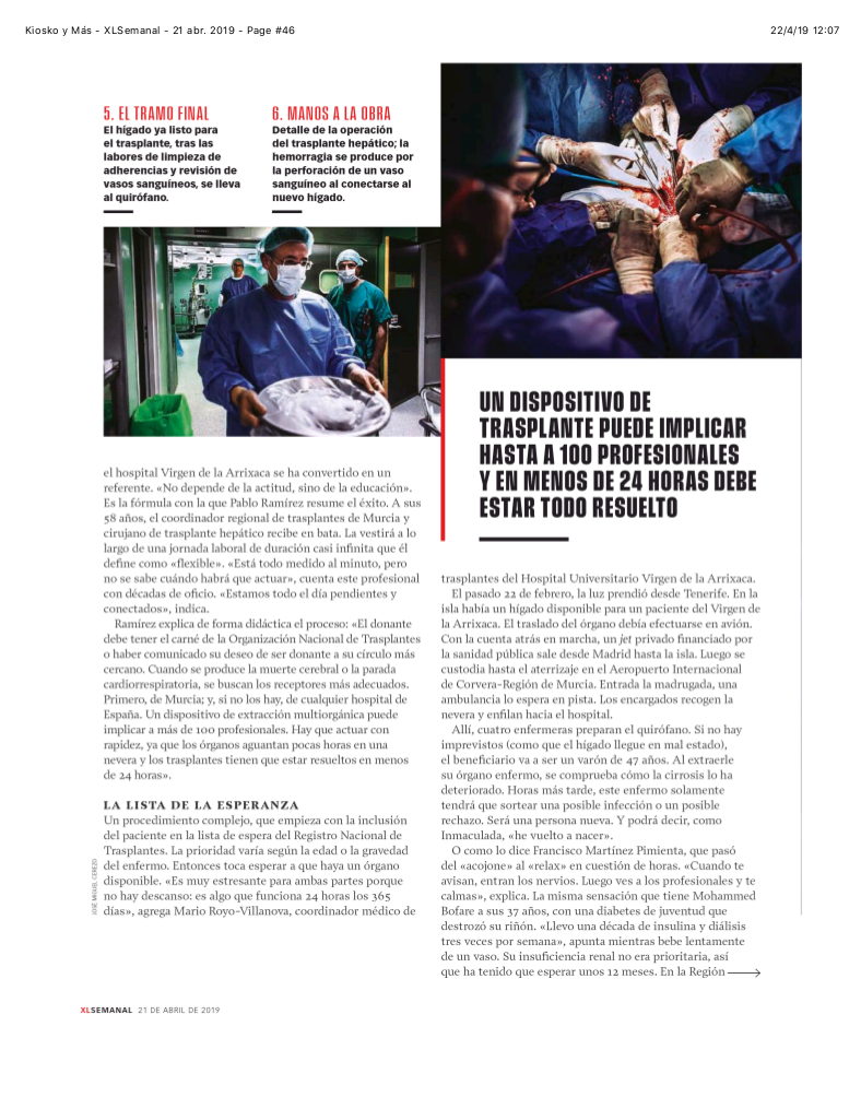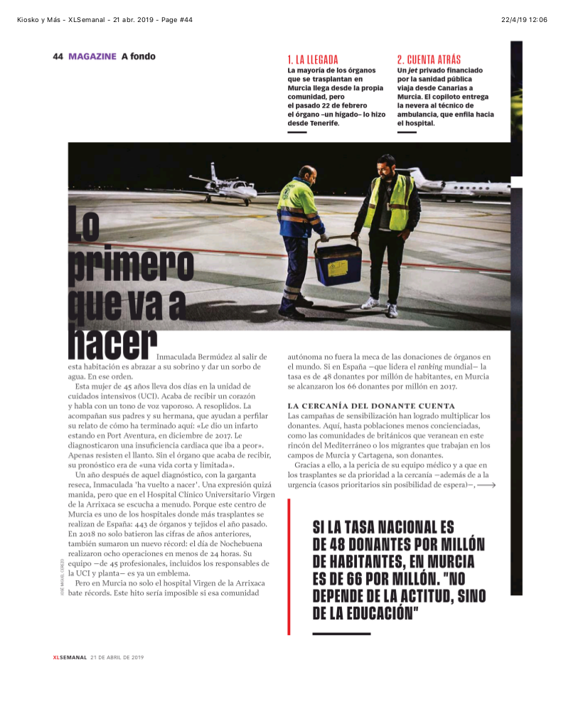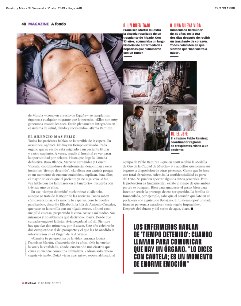 La revista XL Semanal publicó este fin de semana un reportaje dedicado a la donación de órganos siguiendo los pasos de Pablo Ramírez, coordinador regional de trasplantes y director del IMIB-Arrixaca.