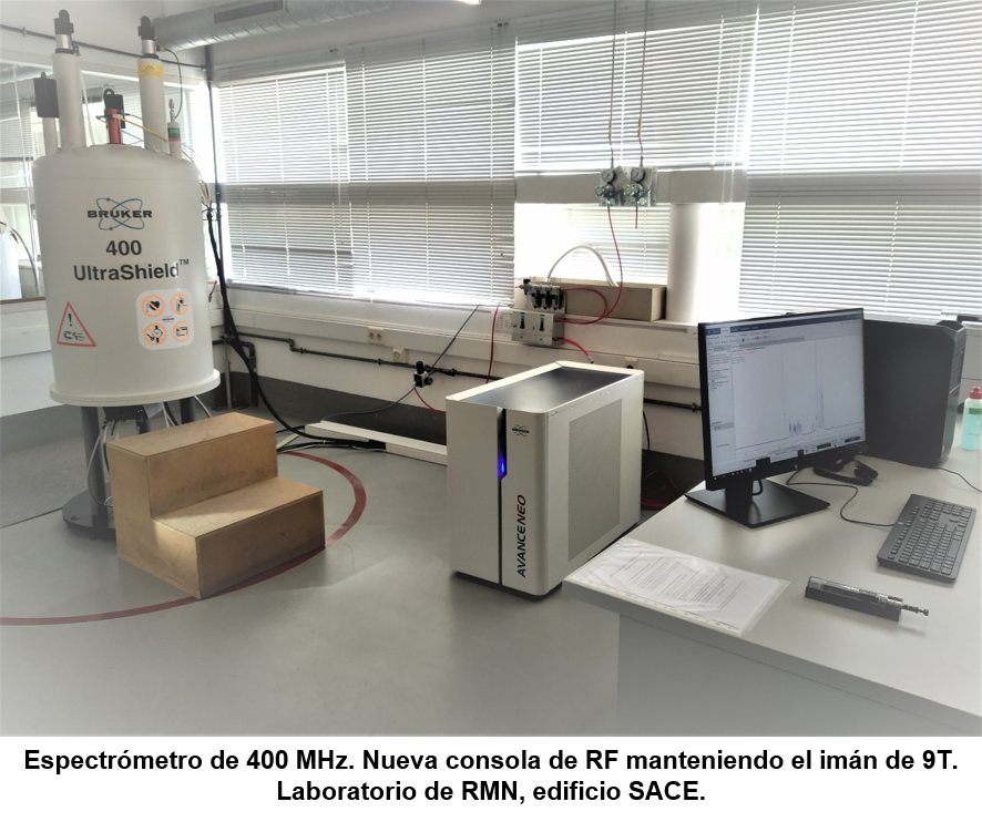 Recientemente, en el Servicio de Instrumentación Científica, se ha llevado a cabo la actualización del espectrómetro de RMN de 400 MHz, consistente en la sustitución de su consola de radiofrecuencias, adquisición de una sonda de última generación y renovación de estación de trabajo y software específico.