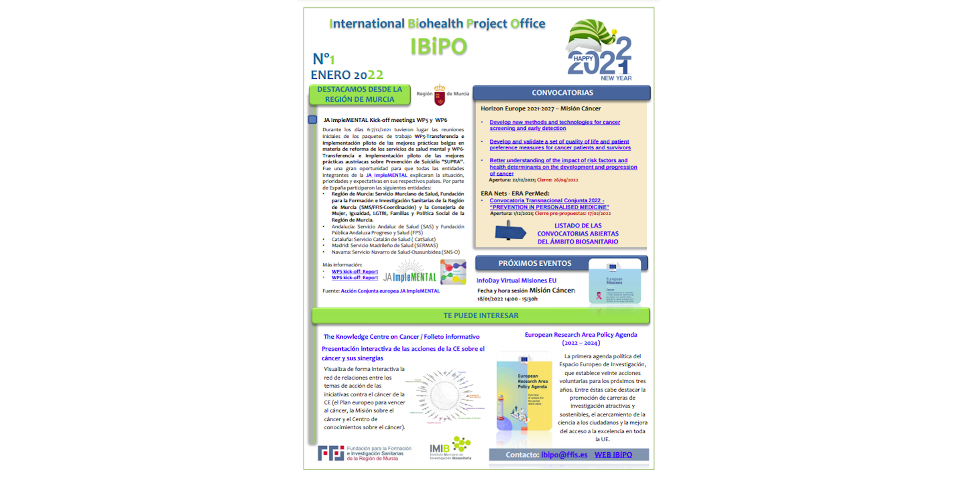 Destacamos que el pasado día 15 de diciembre 2021 se adoptó la actualización 2021 del Programa de trabajo 2021-2022 de las Misiones, que incluye 3 nuevas convocatorias para la Misión Cáncer, y que se relacionan directamente con las acciones previstas en el Plan de Implementación de la Misión. Los días 18 y 19 de enero 2022, la Comisión Europea organizará un InfoDay virtual sobre las convocatorias de Misiones. Las sesiones serán abiertas por lo que no es necesario registrarse. La sesión dedicada a la Misión de Cáncer es el día 18, de 14:00 – 15:30.