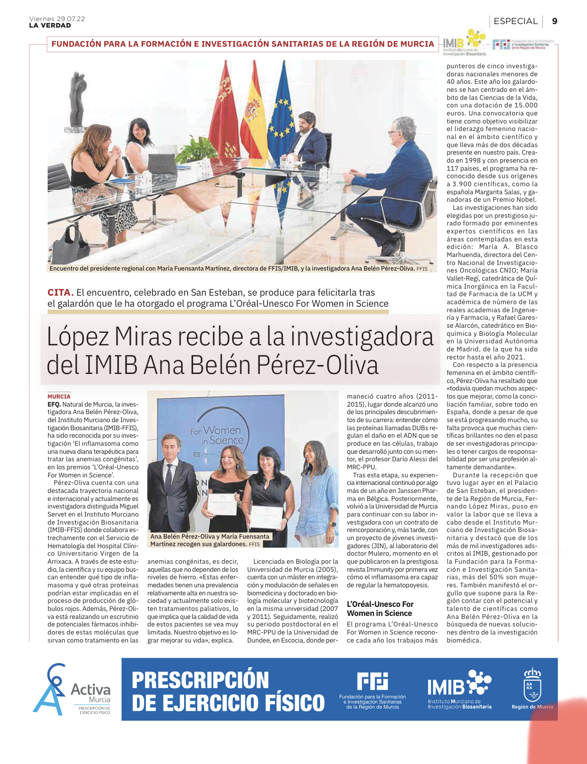 López Miras recibe a la investigadora del IMIB Ana Belén Pérez-Oliva.