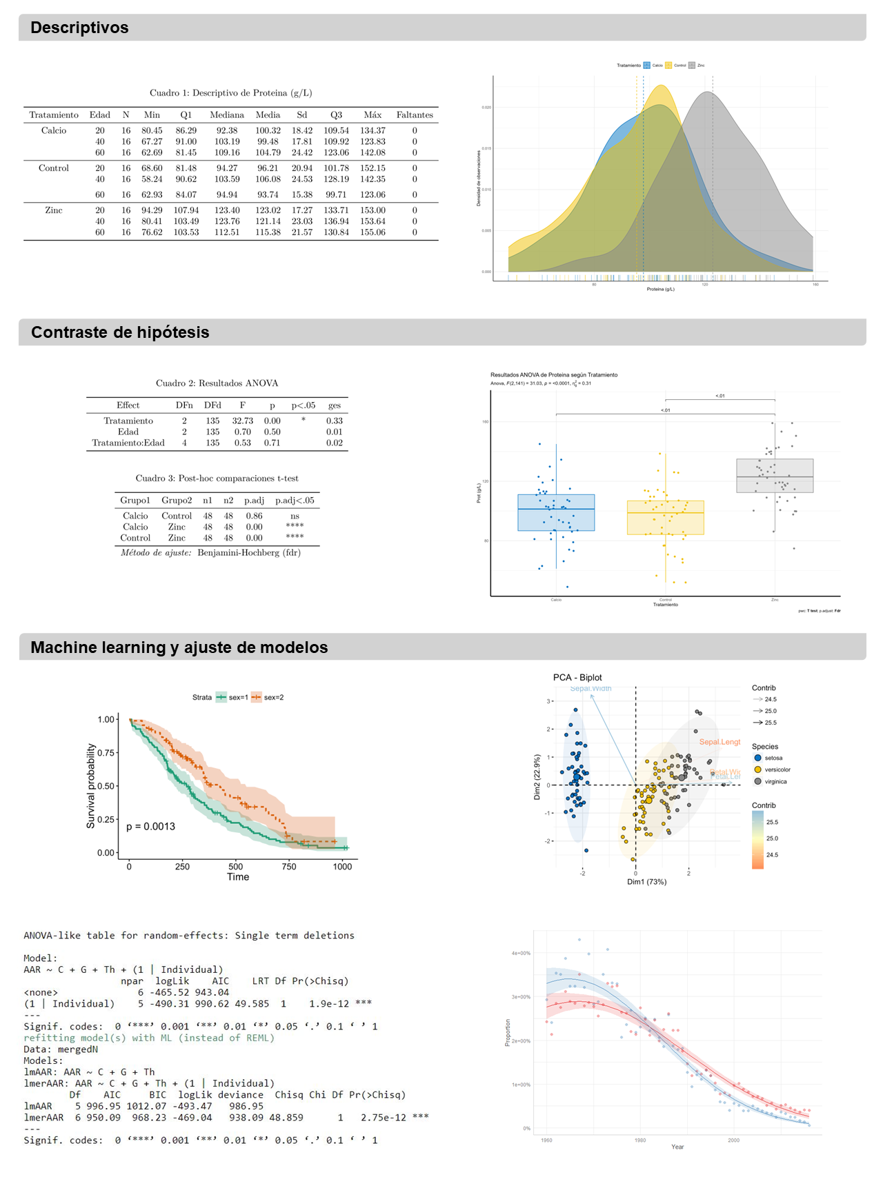 Análisis de modelos multivariantes: Técnicas de ordenación (Análisis de Componentes Principales (PCA). Análisis de Correspondencia (CA). Análisis de Correspondencia Múltiple (MCA). Análisis Factorial Múltiple (MFA). Análisis Factorial Múltiple Jerárquico (HMFA). Análisis Factorial para Datos Mixtos (FAMD)).