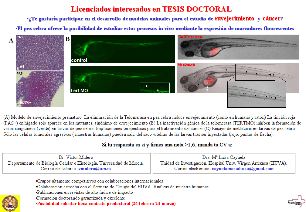 - La línea de investigación estará centrada en el estudio del Papel de la Telomerasa en la formación de tumores y su diseminación (metástasis) utilizando el pez Cebra como modelo.